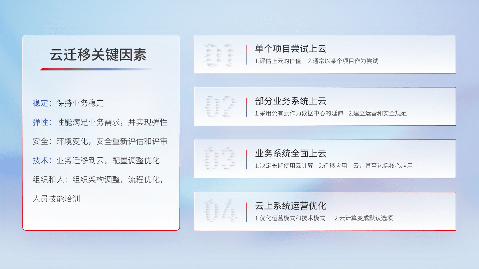 结合实际业务,,,从规划设计、、、、云平台选型、、、、云原生改造、、、数据迁移、、集成交付,,迁移全过程为客户识别最佳上云路径,,,,做好风险识别管理,,,设计网络架构、、、身份权限、、、、安全审计合规、、、操作审计、、日志审计、、监控告警策略、、、、多站点容灾设计等,,,对云上基础设施进行整体规划,,,提升IT治理水平,,,以满足弹性、、高可用、、、高性能的需求。。